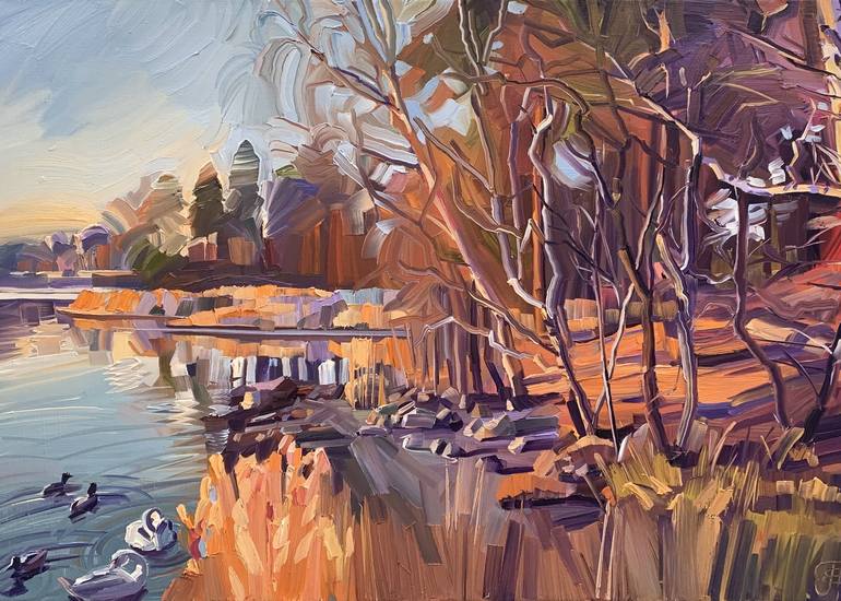 Cozy autumn evening near the gulf of Finland. Materials: Oil on a stretched canvas Size: 50x70cm (~19,7"x27,6") Edges are painted as a continuation of the painting. Has a wall mount. If you have any questions, feel free to message me.