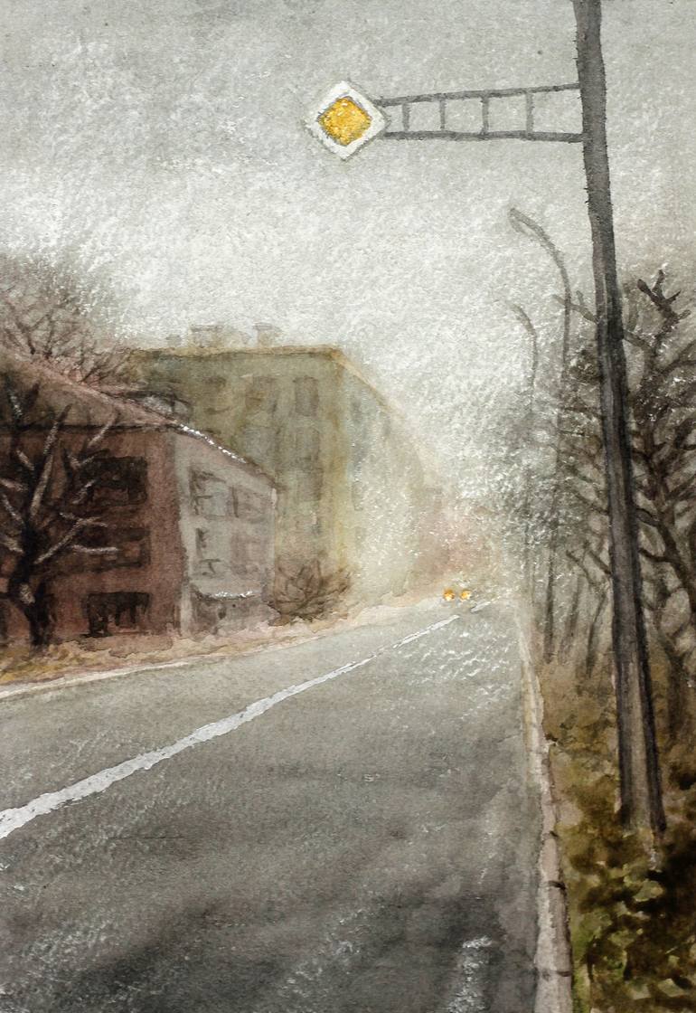 Original watercolor painting - Autumn Landscape, Morning Foggy city view road. Nature watercolor Art. Signed back. Dated on the back. Not framed.