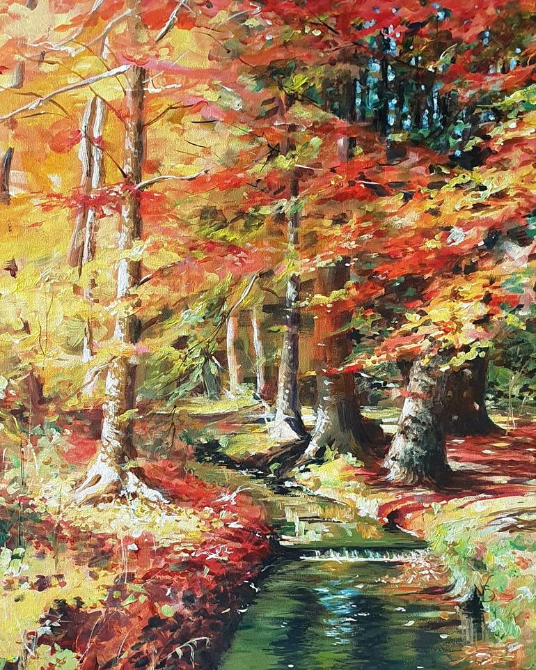 A vibrant autumn forest landscape in acrylic with rich fall colors and expressive brushwork — perfect for adding seasonal warmth and character to interior spaces. This artwork captures the tenderness and comfort of autumn walks, when every step is accompanied by the rustling of golden leaves underf...