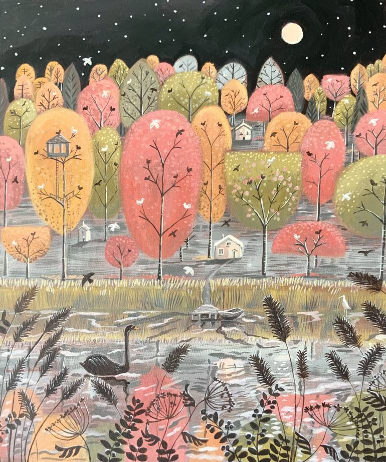 Inner landscape painting of autumn trees reflected in a calm lake, with tiny cabins and birds under a moonlit sky. A black swan glides along the water. Sides are painted grey - ready to hang.
