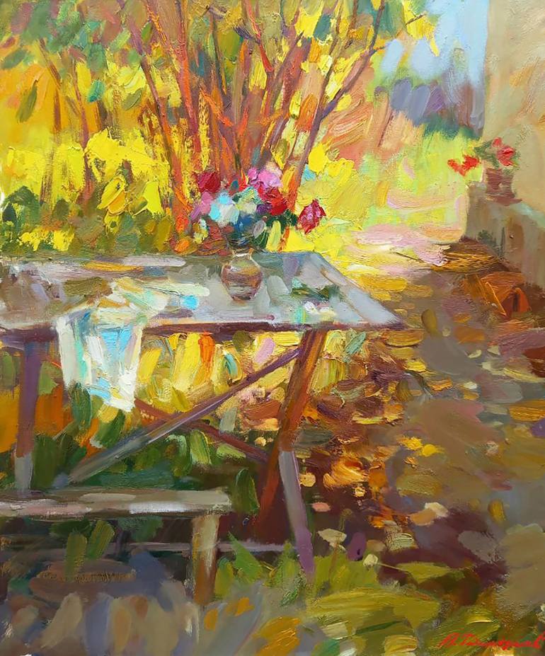 This captivating oil painting depicts the tranquil charm of an autumn garden glowing in warm golden light. At its heart, a rustic wooden table holds a vibrant bouquet of flowers surrounded by soft foliage and shimmering sunlight. Expressive, impasto brushstrokes convey the richness of the season, bl...