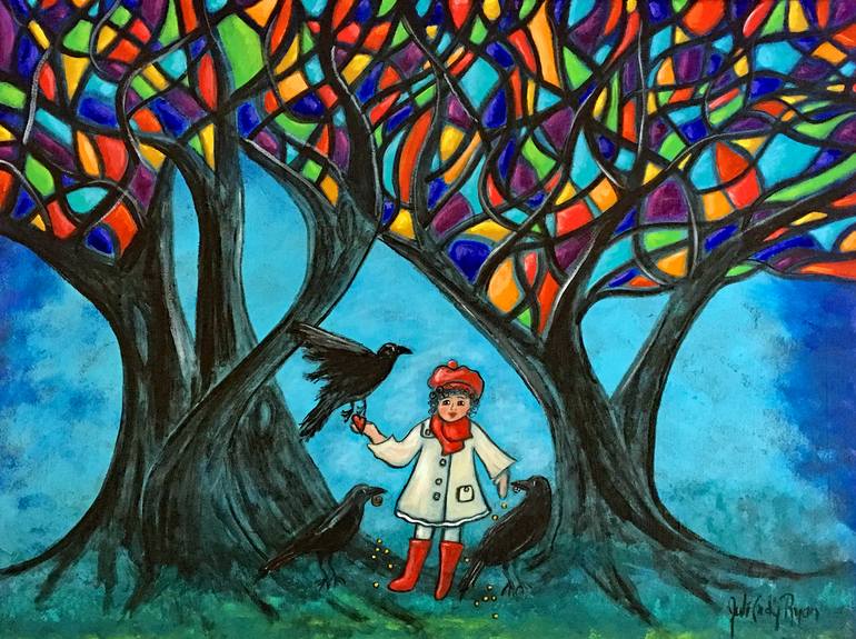Inspired by a story in the news about a little girl who lives in Seattle, Washington, USA. She had a special relationship with the crows she fed. They would bring her little treasures.