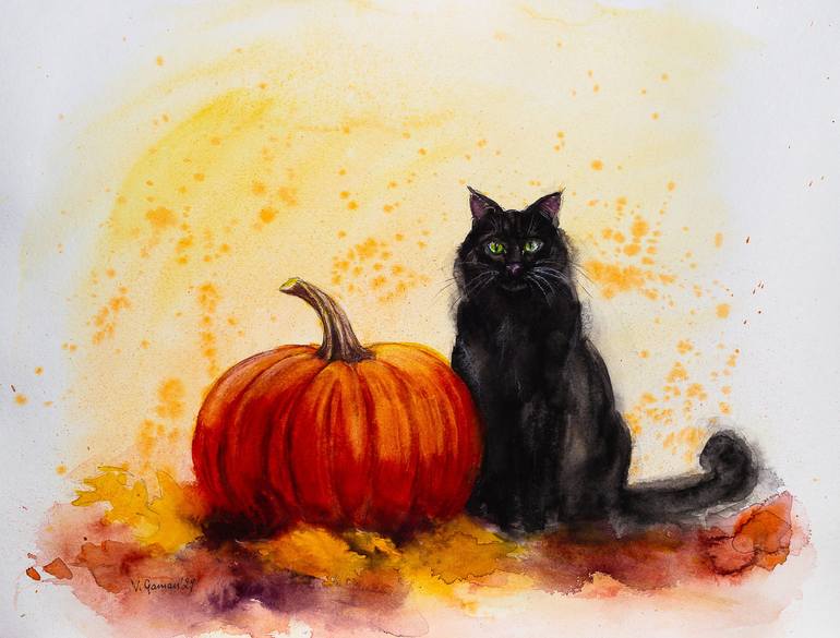 A black cat sits next to an orange pumpkin. Autumn-themed painting. Halloween. For cat lovers. I love animals, especially cats. They bring me great joy, so I was happy to paint this picture with this fabulous and bright plot. The painting will suit both a child's room and any other. I hope that it ...