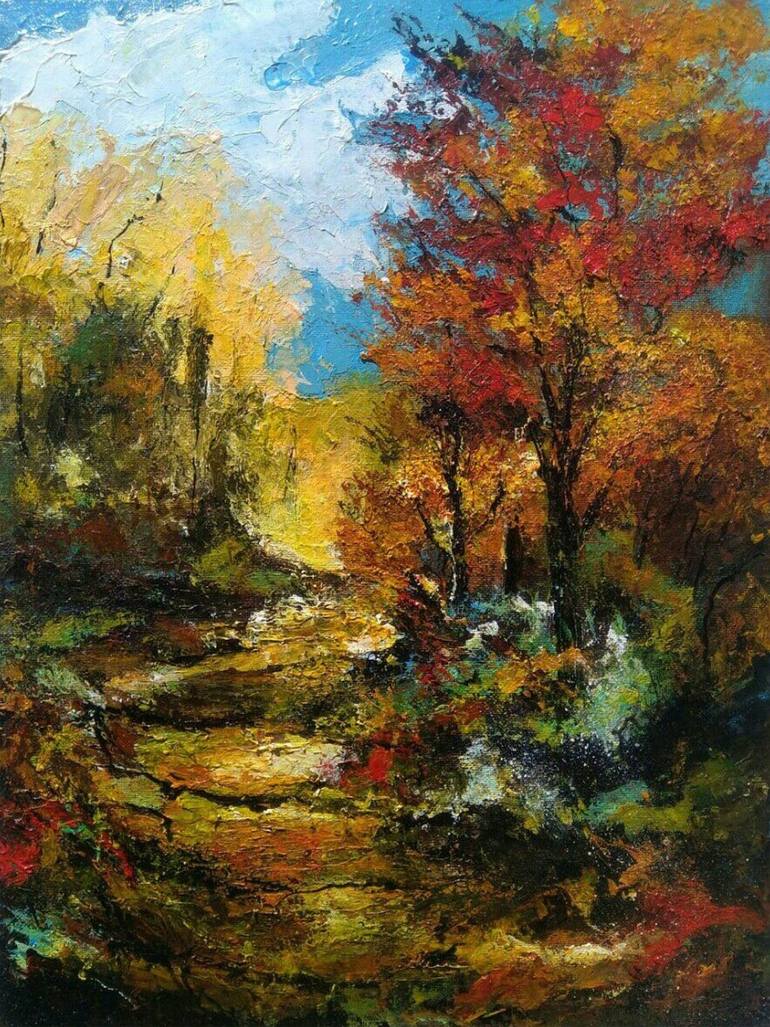 This stunning hand-painted art on canvas titled "Autumn Forest" is a one-of-a-kind piece by artist Sasha Brisac. Measuring 15.7 inches in height and 11.8 inches in width, this medium-sized painting is an original expressionistic and impressionistic piece that captures the beauty of autumn leaves, tr...