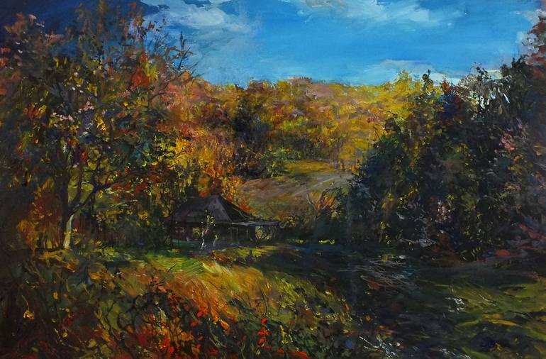 Autumn in the Village, Dimensions 60x90 cm, Oil on Canvas Year 2023 Plein air painting. Realism, wanted to catch up the mood. Added some bright colors and contrast as it seemed to be in nature for a while. Especially when sunlight moved through clouds.