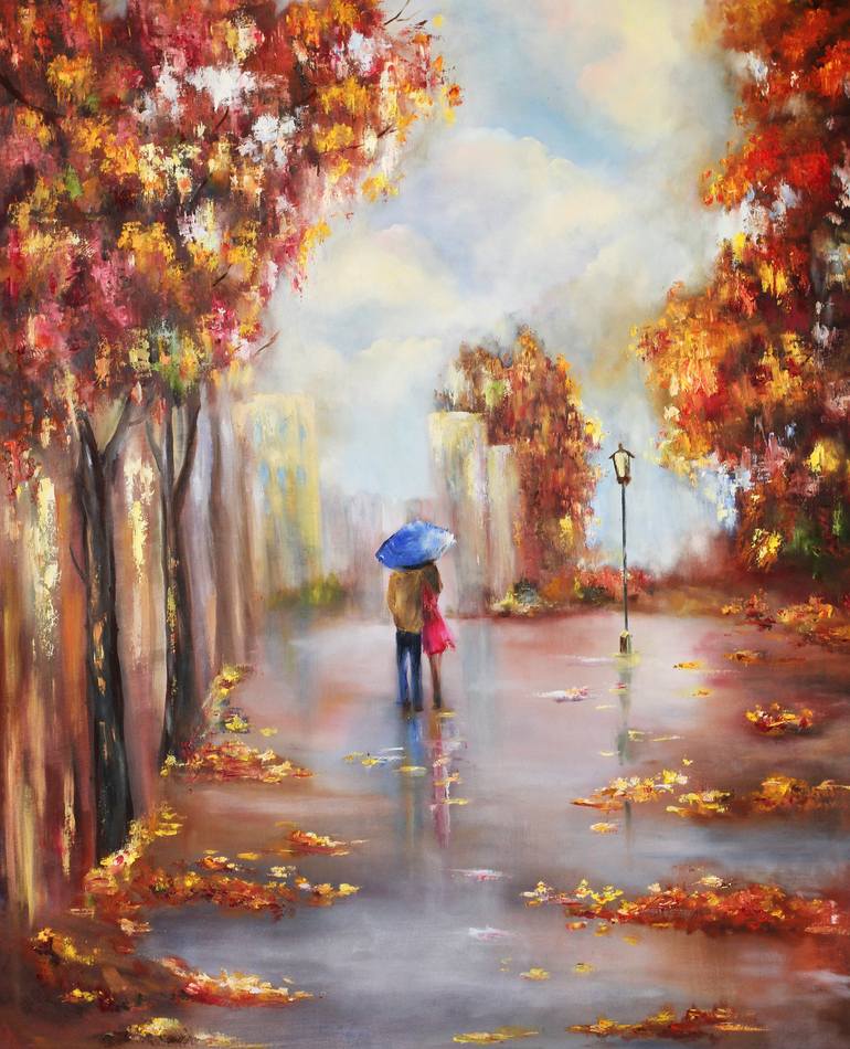 Beautiful autumn Park and rain. The picture is inspired by beautiful autumn and rain. And two lovers under an umbrella in the park.