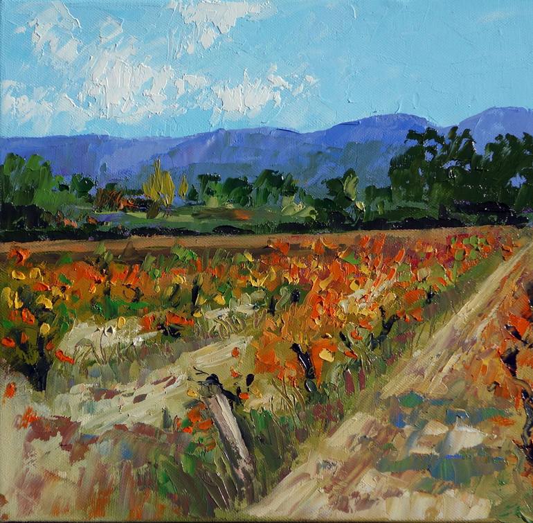 Autumn is undoubtedly the best season to paint the most beautiful landscapes with vines in Provence. Painted outdoor with a pallet knife