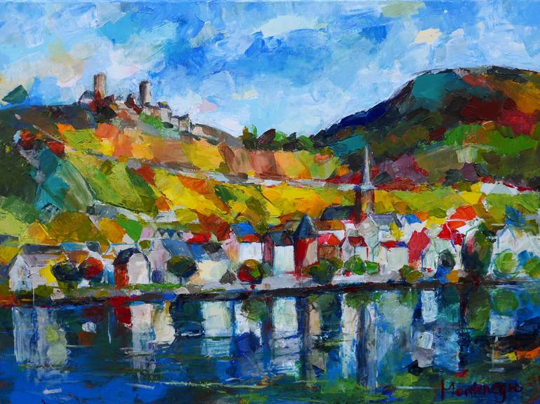 This artwork shows a Moselle landscape with autumnal vineyards near Alken with Thurant Castle. It was created en plein air. The sides of the painting are covered with paint, creating a lively, three-dimensional look. It does not need a frame and is ready to hang.