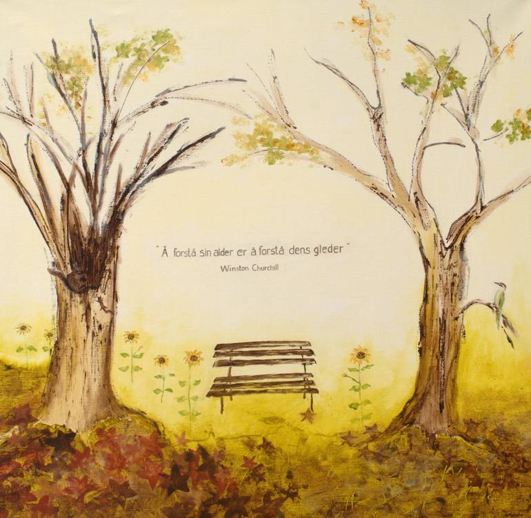 A symbolic painting depicting the joy of age. Two big trees in a park, one hollow, but still alive and has given home to new life. An old bench under the trees waiting for someone to join in... The quote (in Norwegian) would translate to something like: to understand their age is to understand its j...