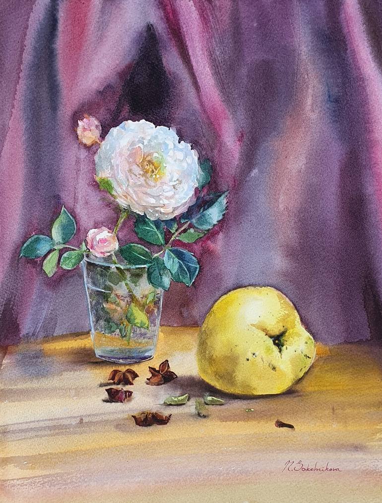 Original artwork "Autumn rose" is 42x31 cm, 50x40 cm framed. It is painted from life, at one beautiful lady's home. She allowed to cut the rose from her garden, still flowering at the end of October and we enjoyed painted together. You can find my original signature on the right low corner. -HAND...