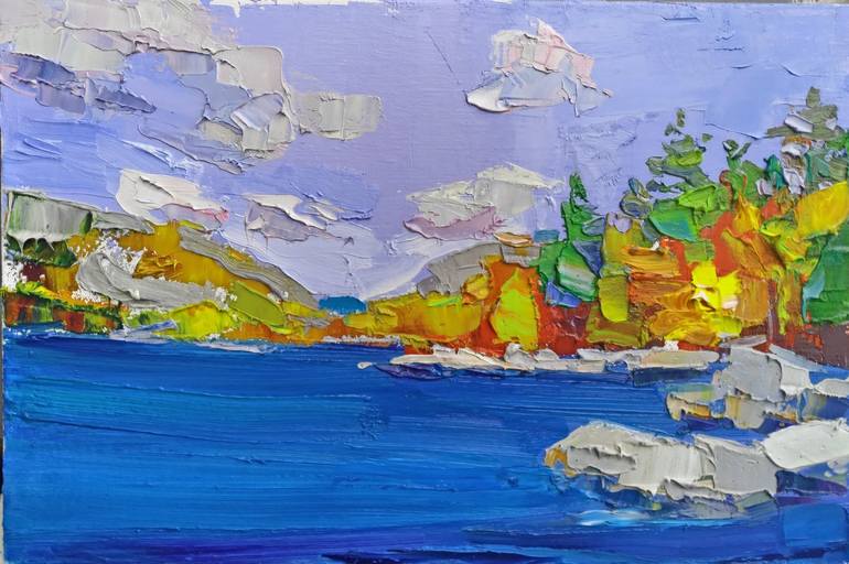 Original oil on canvas small landscape painting. Impressionistic etude. An attempt to catch fast changes of light and colors on plain air. Impasto. Impressionism. Expressionism. Master-quality material has been used. Heavy impasto builds with brushes and pallet knives. Edges of the painting are cov...