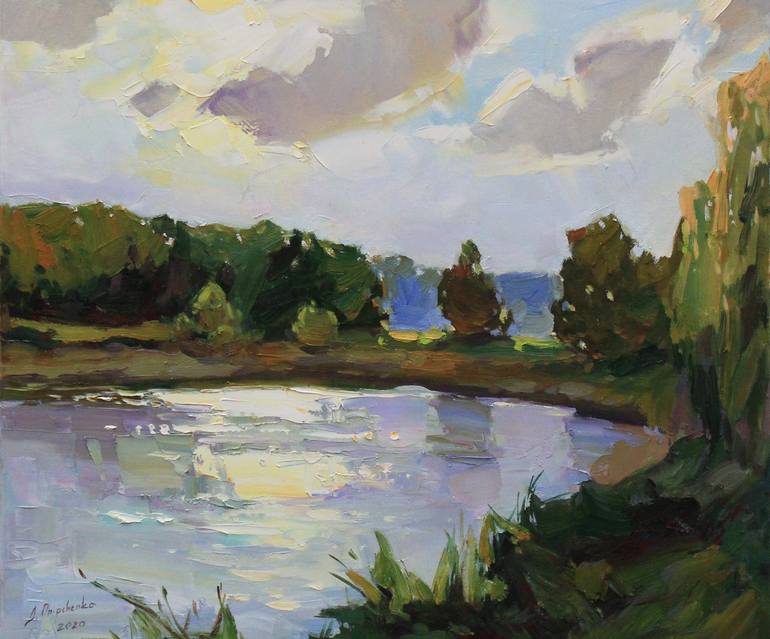 Original Oil painting by Ukrainian artist Alisa Onipchenko Autumn landscape with lake and clouds in green and blue colors. Impressionism. Plein air painting from nature. One of a kind artwork. Ready to hang stretched canvas painting. "Autumn sun" 50.0 X 60.0 CM / 19.7 X 23.6 IN HIGH QUALITY oil o...