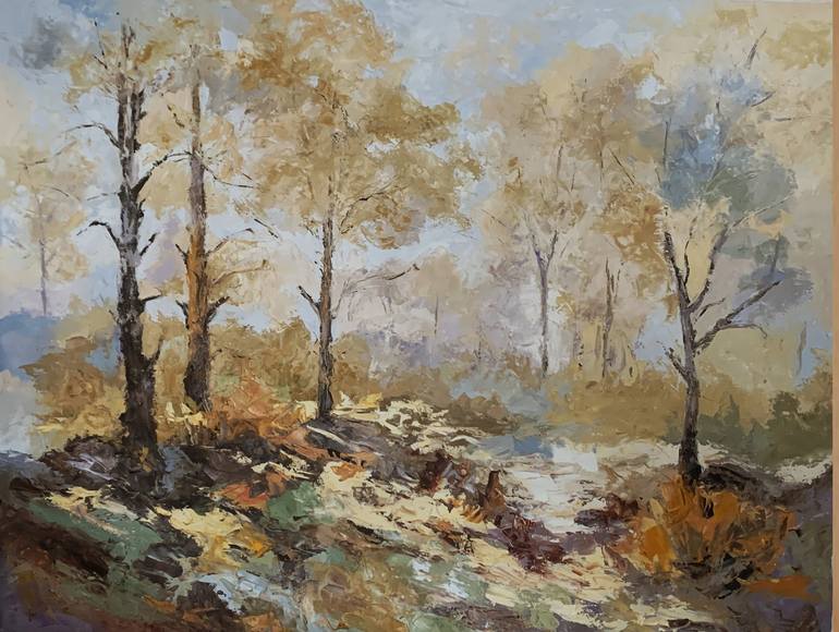"Autumnal Light in Golden Woods"captures the warm and hazy atmosphere of a forest in autumn. The golden and brown hues of the foliage are illuminated by a soft, diffused light, creating a sense of tranquility and the gentle beauty of the changing seasons. This piece would be a comforting addition ...