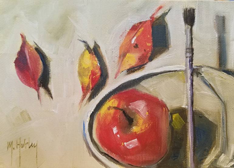 A small painting of a red apple and red autumn leaves. Unframed on a canvas panel. Mary Hubley lives and paints full time in her studio in Florida after spending many years working as professional illustrator. She shows her oil paintings in prominent art galleries, and has won international award...