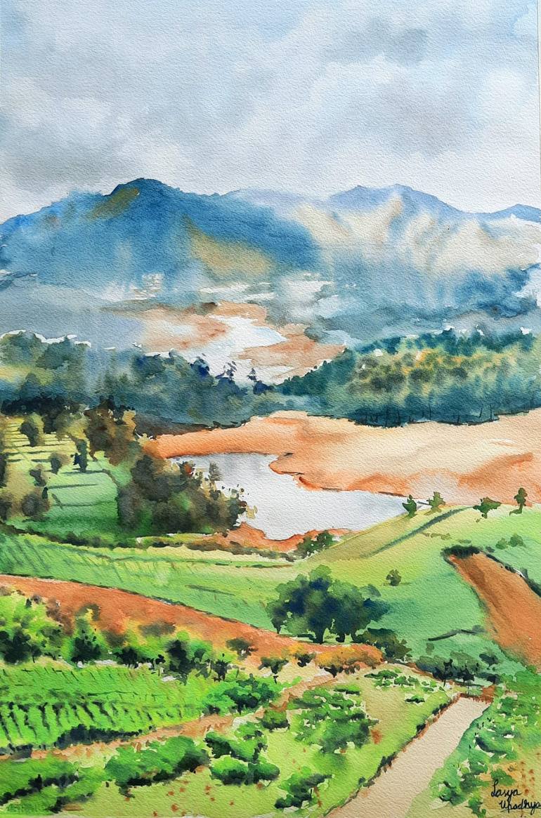 An impressionistic painting of beautiful Ooty landscape from atop the Nilgiri mountains, with the lovely Avalanche lake in midst of lush green tea estates.