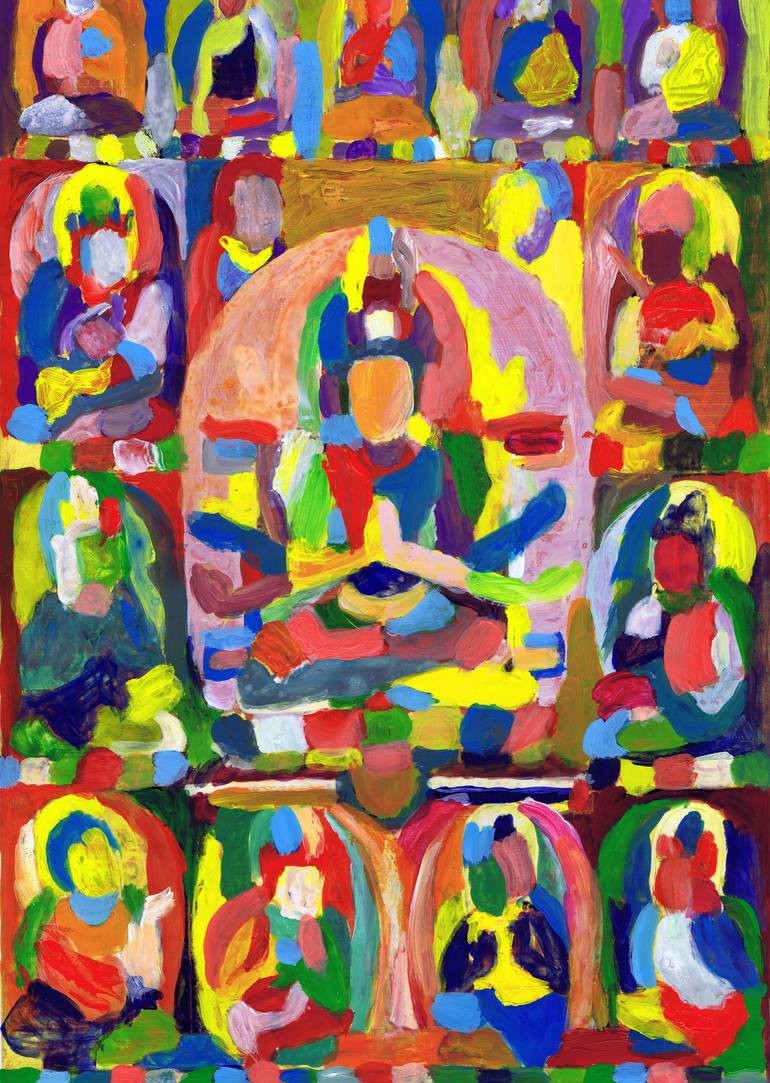 Overpainting a photo print on glossy paper of a buddhist thangka. I take the example of the history and give example by my variation.