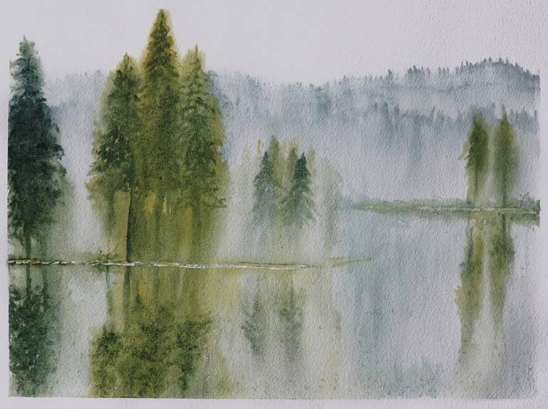 Avalon is the vision of a lake island lost in the mist. With loose style, this watercolor shows different greens that seem to change with lighting. Rainwater, natural pigments, watercolor and holographic mica on pure cotton Arches paper, hot pressed 300g/m – 140lb. Size: 16x 12 in (41 x 31 cm). ...