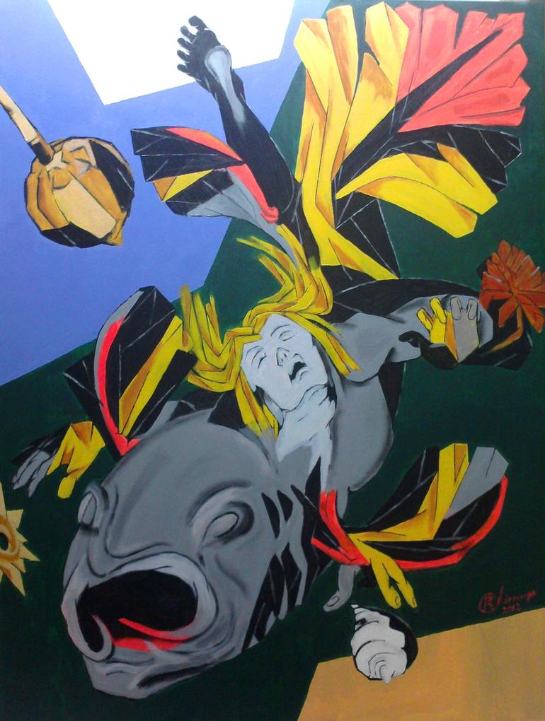 Acrylic on Canvas Based on Indian Mythology. Matsya, the fish, from the Satya Yuga. Lord Vishnu takes the form of a fish to save Manu from a flood, after which he takes his boat to the new world along with one of every species of plant and animal, gathered in a massive cyclone.