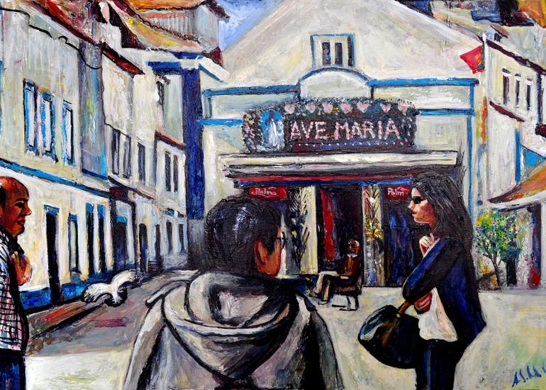 This acrylic painting featured a central place in a small old fishing town Ericeira near Lisbon on Atlantic coast of Portugal. This town is very famous as a nice place for advanced surfers. Also this place has a great vintage spirit with many old houses, cafes and restaurants. Ave Maria Ericeira pai...