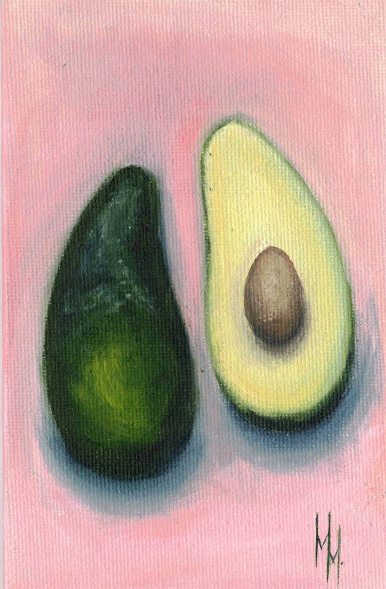 The painting depicts an avocado cut into two equal parts. The first half shows a smooth dark green peel, and the second part reveals a juicy, creamy flesh, rich green color with a large stone inside. Droplets of juice sparkle on the fresh flesh, creating an appetizing appearance.The sliced avocado l...