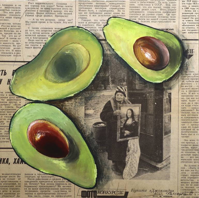 Avocado halves are painted with professional gouache on old retro newspaper. The newspaper is glued with special glue to a hard cardboard measuring 10 x 10 inches. The work is covered with professional varnish. The painting is protected from fading of colors. Can be hung with or without a frame.