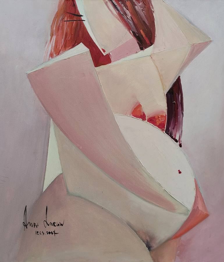 Indulge in the exquisite composition that unveils the portrayal of a reclined nude woman awash in a palette of tender, warm hues, where the gentle interplay of pink and lilac tones gracefully envelop her form. A profound narrative unfolds, one that centers around the anticipation of new life, as she...