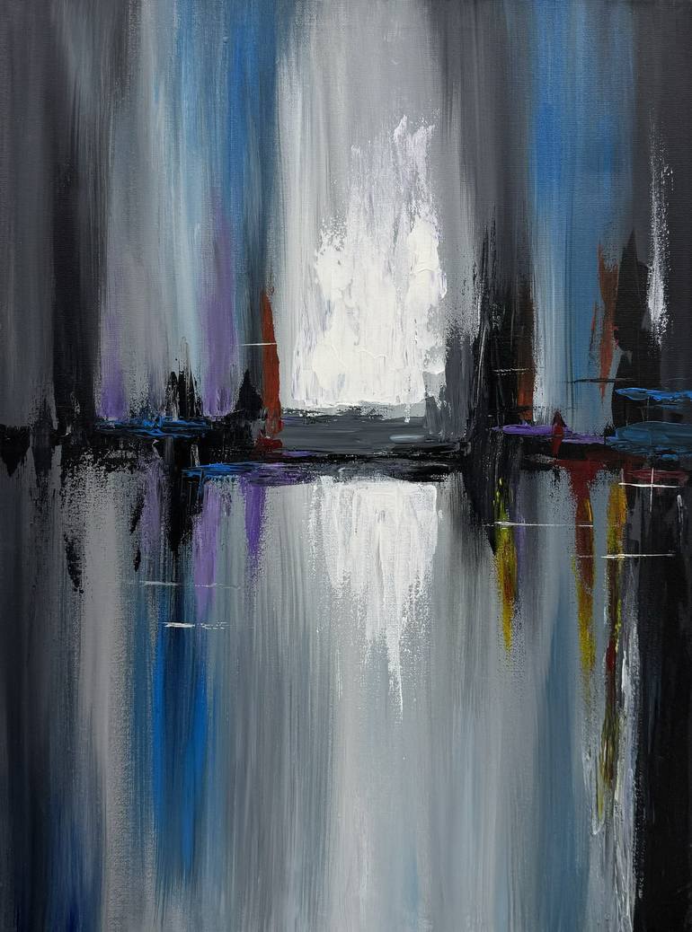 Awakening captures the quiet power of rising from darkness into light. Deep blue and black strokes blend into a soft white center — like an inner voice finding clarity. This piece is about stillness, healing, and subtle energy. Perfect for modern interiors and collectors who seek art with calm in...