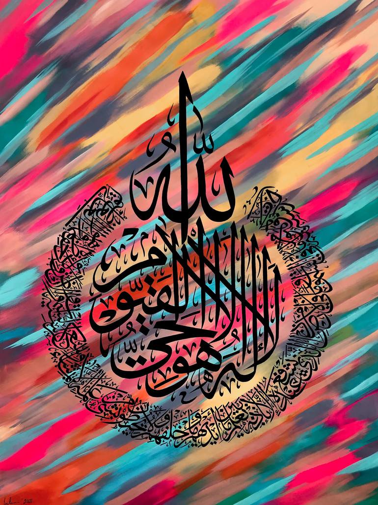 This powerful artwork features Ayatul Kursi (Surah Al-Baqarah 2:255)—one of the most important verses in the Qur’an—beautifully written in modern Arabic calligraphy. The artist blends traditional Islamic script with a bold, colorful background full of energy and movement. The calligraphy, drawn in ...