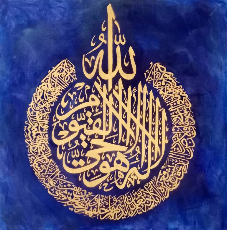 Ayat ul kursi is written with gold on deep blue coral background. Medium is acrylics on Canvas. It is inspired from the blessings of Allah Almighty and his forgiveness on us. May Allah showers his blessings upon all humans. By Ayat ul kursi recitation Allah provide 70 angles for protection. It's a p...