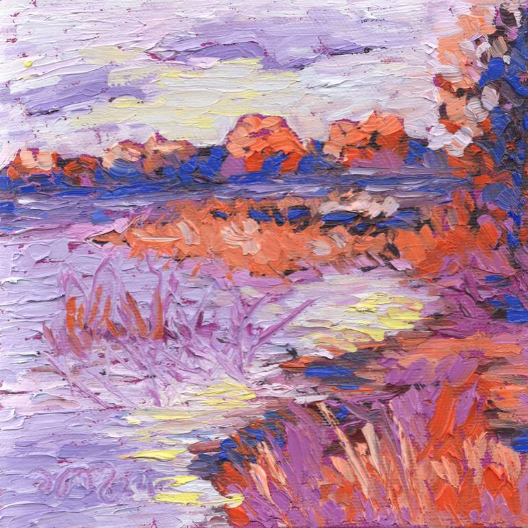 A view of the Ottawa River in Aylmer Quebec, thick textured paint in vibrant purples and oranges. With the artwork's deep 1.5" profile and sleek black edge, this painting doesn't require a frame unless you really want one. It can also accent a small shelf.