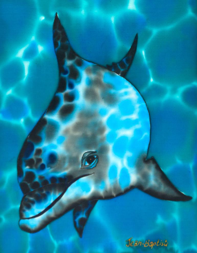 A baby dolphin coming to the surface in the Caribbean sea. This piece was painted in a batik technique using cold wax resist, water-based pigments applied to 12mm Habotai silk. I am painting a limited edition series of 150 versions of this motif. Since each one is individually painted no two are al...