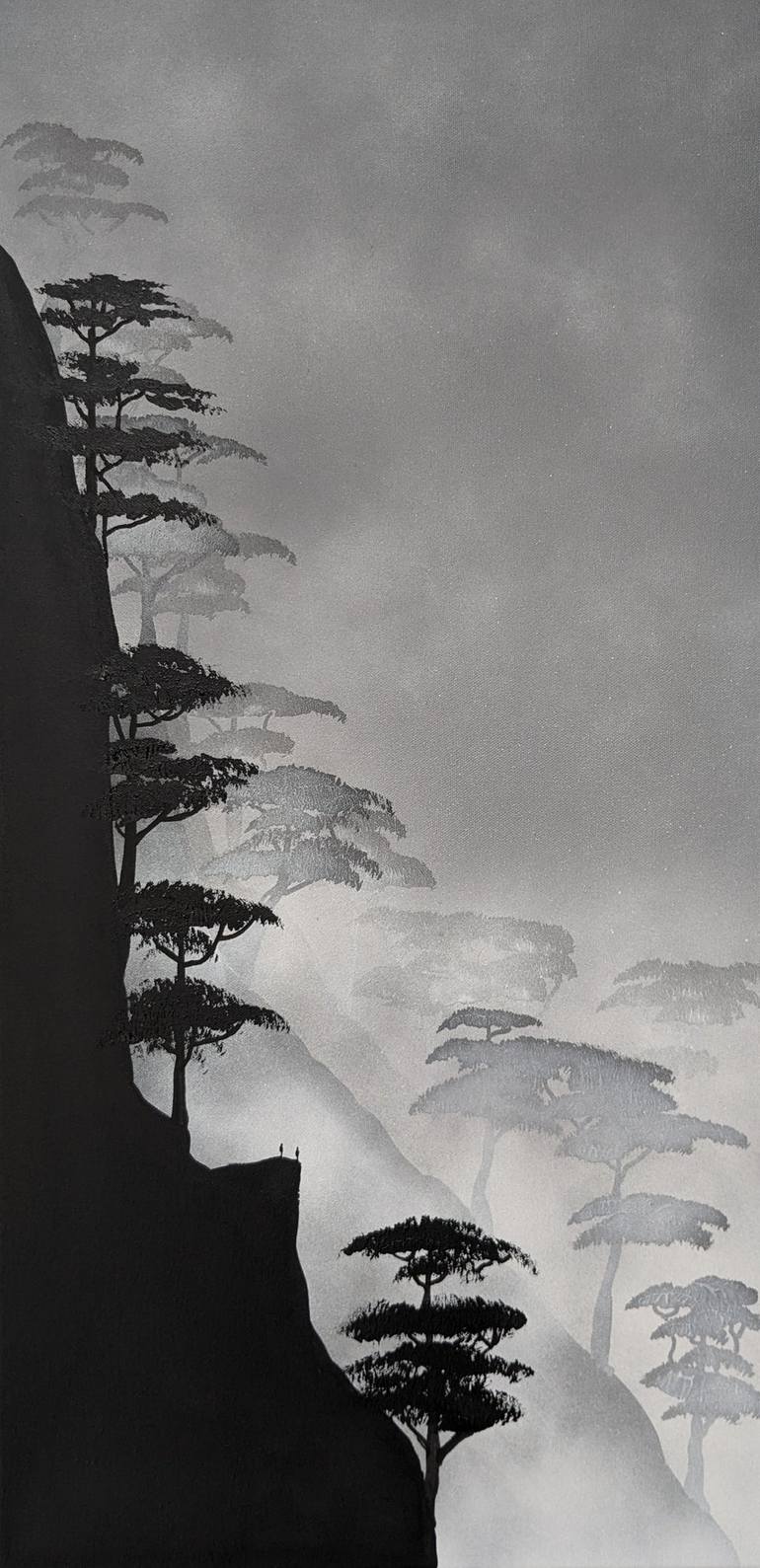 Art wasn’t an option for Bloomfield after school, as he needed a steady paid job. But one day, to be different, he painted a birthday gift for a friend. They hung the artwork up right away, which spurred him on to paint again, and he hasn’t looked back since. Bloomfield’s art combines ideas of his two favourite artists [Rothko and Gormley] by placing figures in stark and sometimes harsh landscapes with unyielding horizons. His favourite material is spray paint: “I often used spray paint as a teen when out creating guerrilla art with friends in London. The idea of using street material in a more traditional way appeals to me”. He prefers working with the cool tones of greys and black as it leaves more to the viewer’s imagination. The art Bloomfield creates comes from endless introspection, and a variety of inspiration. His work is thoughtful, and presented in an accessible way for a wide audience. In his own words: “Everyone should have an original painting in their home”.