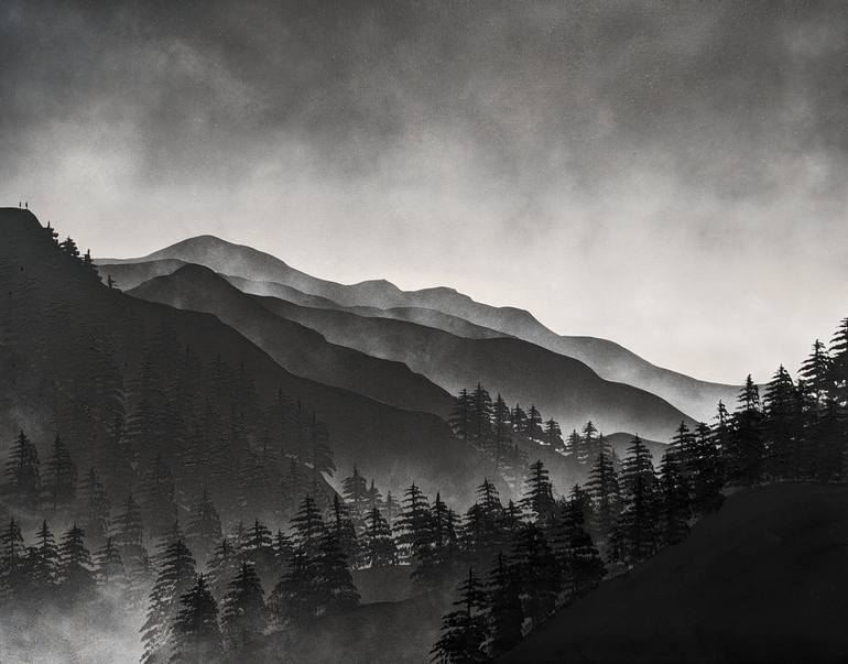 Art wasn’t an option for Bloomfield after school, as he needed a steady paid job. But one day, to be different, he painted a birthday gift for a friend. They hung the artwork up right away, which spurred him on to paint again, and he hasn’t looked back since. Bloomfield’s art combines ideas of his two favourite artists [Rothko and Gormley] by placing figures in stark and sometimes harsh landscapes with unyielding horizons. His favourite material is spray paint: “I often used spray paint as a teen when out creating guerrilla art with friends in London. The idea of using street material in a more traditional way appeals to me”. He prefers working with the cool tones of greys and black as it leaves more to the viewer’s imagination. The art Bloomfield creates comes from endless introspection, and a variety of inspiration. His work is thoughtful, and presented in an accessible way for a wide audience. In his own words: “Everyone should have an original painting in their home”.