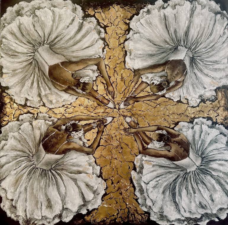 This extra-large oil painting depicts four graceful ballerinas sitting elegantly against a rich, golden background. Their delicate, flowing white dresses resemble the soft petals of flowers, creating an ethereal and almost dreamlike atmosphere. The ballerinas, poised in serene positions, exude a sen...