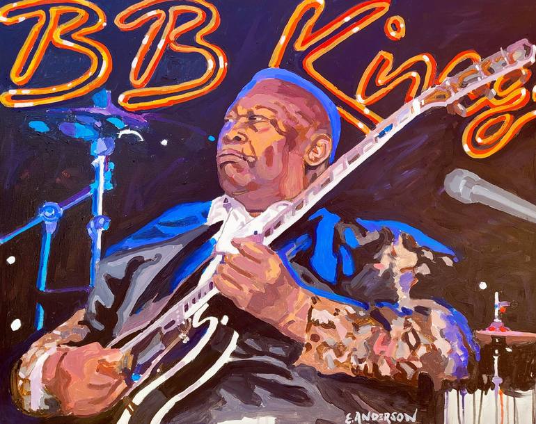 captured in vibrant colors surrounding the musician, as he intensely plays the guitar, eyes closed, lost in the music. Bold neon-style signage reading "BB King" suggests the setting could be a famous venue or a tribute to the legendary blues guitarist B.B King.
