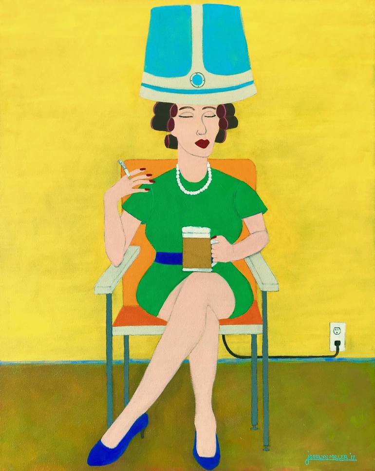In preparation for an evening with Betty and Stu, she requires a bit of pampering, and a cig and a sud. I love using bold colors and a flat style to emphasize the humor in my work. I often throw in an unexpected element to further the interest, and in this case, Loretta is smoking a cig and enjoyi...