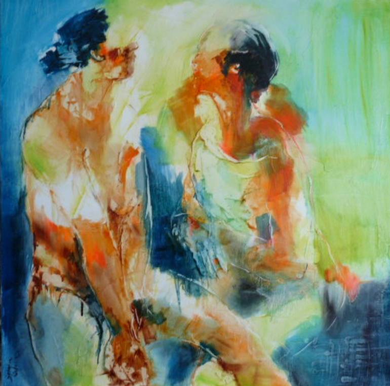 deux femmes papotent dans le soleil... c'est l'été... la lumière sur les corps sublime ce moment et je prends mon crayon pour fixer ce moment. La superposition et la transparence des couleurs souligne les corps suggérés..