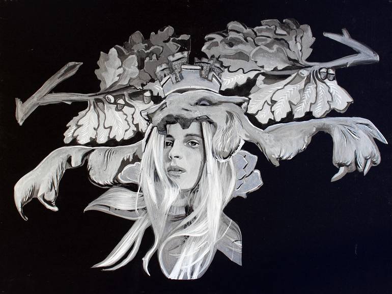 When painting, headdresses and crowns deify Kate Kelton’s subjects. She uplifts the Unsung Sheroes & Heroes, Patriarchy Smashers, Warrior Survivors, Silence Breakers, Philosophers, Truth-Tellers, Whistle Blowers and Thought Giants of all stripes. She paints her portraits cloaked in the garb of statues Ladislav Šaloun sculpted onto the train station that her great-grandfather, Josef Fanta, designed for Prague in 1901 - 1909. Apotheosis through a reclaimed, reapplied Art Nouveau. Sampling her own lineage, she transforms a historical body of work, itself a thing of lasting beauty; exchanging granite for graphite, plaster for paint. In Photoshop, she first combines the desaturated faces she's found, sourced or shot of her chosen subjects, with the black and white photos from her family and friends, of the statues in situ. Then she uses graphite, inks and acrylic paints and glazes to create the works on panel or canvas, literally uplifting and elevating her battle-weary subjects to the highest reach of architectural strata. 'Ancient and distant godlike beings, surveying a dying empire, trade places with the fresh blood of her subjects. The work presents a tactility against the digitized space, and represents a taking, an acquisition of power back from the tastemakers. Here, the mantle of the artist is above brand influencer, above internet commentator, above mere marketability. In their gaze is a warning, “Art is immortal. Come for me, why don’t you?”' ~ Micah Chaim Thomas "Kate's recent work is a matter of expansion through contrast - she is as ephemeral as her subjects are concrete architecture; she is structural when her subjects should slip through your fingers like too-fine sand. Taken as a whole, the works in her magnificent series Sentry are incredibly intelligent, but when looked at individually, you come to understand that these are statements of life beyond themselves. The series take embellishments of a Prague train station designed by her great-grandfather, Josef Fanta, and combines these with portraits of women who have stood against the sexual harassment and assault rampant in Hollywood. These women, like Kate herself, have suffered in the era where powerful men, every bit as immovable as the train station, wielded their power without check. The portraits emblazoned on architectural elements, they are marked against the edifice, every bit as permanent, and perhaps even more defining.