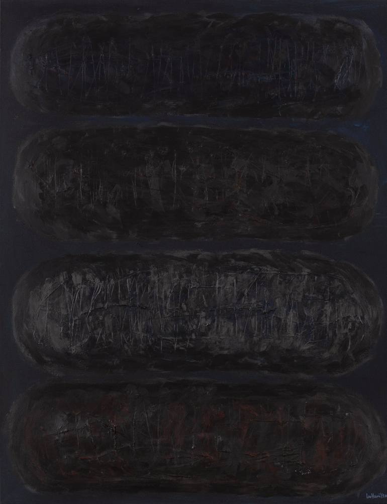Lou Hamilton is an artist, multi-award-winning filmmaker & podcaster. She makes abstract paintings, which aim to help create quiet, meditative spaces to live and work. Concerned mainly with the abstract & working with found materials, oils, inks, plaster & acrylic, Lou is currently exploring chaos & calm through simple textures inspired by the landscape. Whether on paper, textile or canvas, they give a lens through which to view the world, a moment to stop, pause & consider Lou’s grand-father was the figurative painter Geoffrey Tibble 1909-1952. He was one of the distinguished & influential group of artists that emerged from the Slade at the of the 1920’s and was a member of the Euston Road School of Painters. His work can be seen at the Tate, and is in many collections around the world. In 1933 he with William Coldstream, Victor Pasmore & Rodrigo Moynihan founded the Objective Abstraction movement. It was short-lived but Lou has taken up the mantel through her work. Lou grew up in the wild, open and ancient landscape of Wiltshire, and every year since childhood has spent summers amongst the scorched, saturated colours of South of France. For five years she lived and painted in the Lake District, Cumbria and South West Scotland. Now she has settled on an Island in London, surrounded by water, glass-clad buildings, and graffiti covered walls and textured, peeling surfaces. The light, texture & colours are an ever-changing source of inspiration. Her studio faces the same view that Turner painted, an influence not lost on her. Lou’s paintings are inspired by landmass, aerial views, microscopic, energetic reflections of water, light, flags & urban textures. They might appear as simple bands of colour, in a 3-act structure, that bely the depth of surface, or scratched sgraffito layered works that allow the colours & underpainting to show through the cracks & broken surface. She uses oil pastels and scrapers to make marks & lines trailing across the surface. Working first with vigorous, energetic textural strokes in acrylic, then manipulating the surface with veils of acrylics or oils mixed with organic walnut oil, medium & sometimes plaster, she builds up layers until they start to resonate and ‘hum’. At that point she knows she’s hit the sweet spot. Her aim is to create a deep expression of landmass or city scars or aerial mapping at an elemental level.