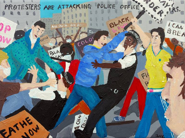 This painting is based on the Black Lives Matter demonstrations in London, UK. Protesters are attacking police officers. BAD PAINTING is an anthology, a document of our time. It is a series of paintings that I categorize as Bad Realism which is work that is not only bad in terms of style & crafts...