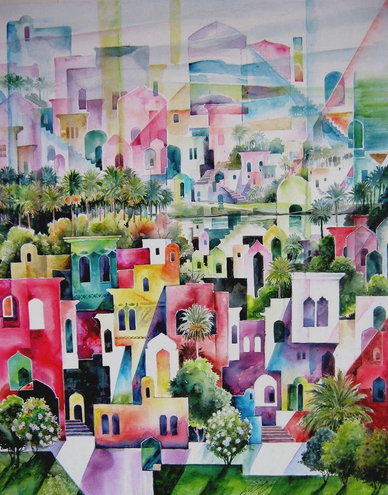 This clean world of Baghdad once a great city has been arranged as a dreamy alternative to the horrible reality, only children deserve to live there. This work is loose and will be shipped rolled