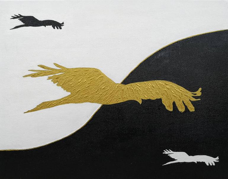 From a series of paintings named 'Golden Thread', the concept developed naturally without much thought. The image of the bird is a silhouette of a photograph I took many years ago, which stayed with me for some reason. I took the image to build on concepts of freedom and power, and to represent the ...