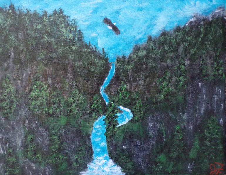This is a painting I completed this year in 2024. I wanted to paint a landscape image with a bald eagle. I started with painting mountains and trees, and then I added the waterfall. The side of the mountain is covered with evergreen trees. The waterfall cuts through the waterfall and runs down.