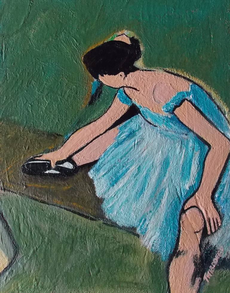 Inspired by Artist, Edgar Degas B. July 19, 1834 D. September 27, 1917 Ballerina on bench was painted on a sanded piece of plywood then gesso, sketched with charcoal pencil, layered with acrylic paints Reverse has hardware; D Rings with plastic coated, stainless steel wire ready to display, hang. ...