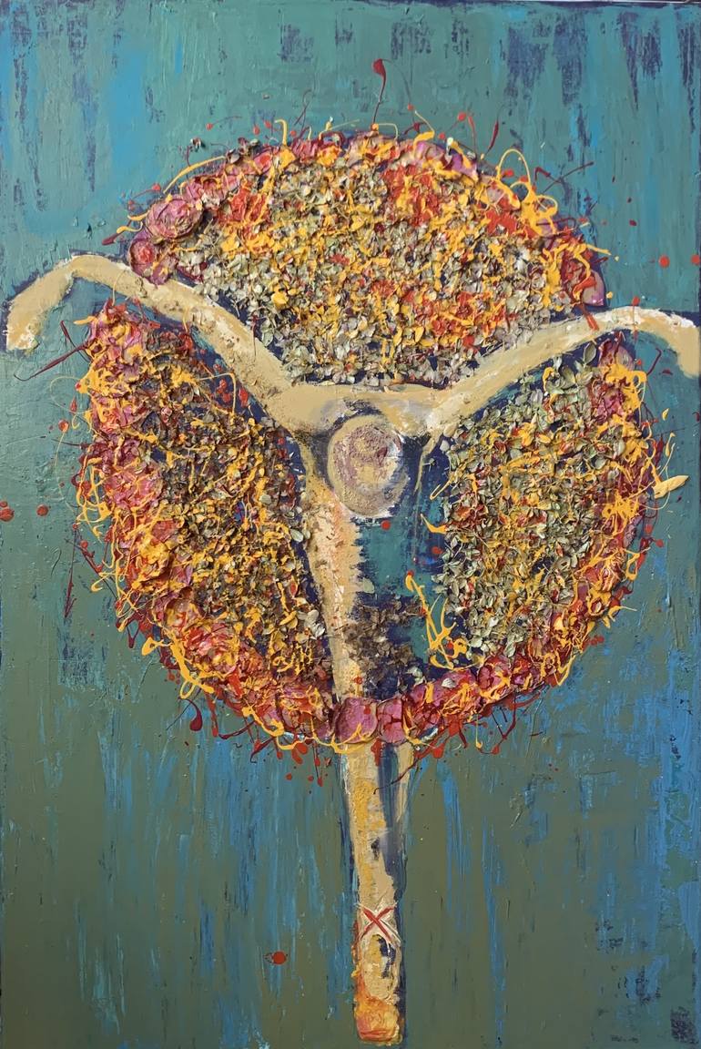 Part of a series of organic figurative artwork representing people, in this case a ballerina. Her tutu is made of flowers covered with acrylics, rendering a texture