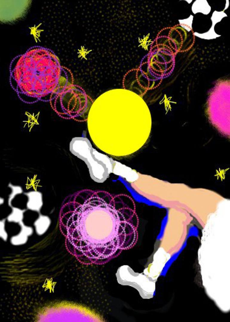 I made my work in Photoshop Paint. I was inspired by my own screenplay. I show on my painting how ballerina is playing with the moon as the football (soccer) player. I started to paint on my computer instead with my hands on paper.
