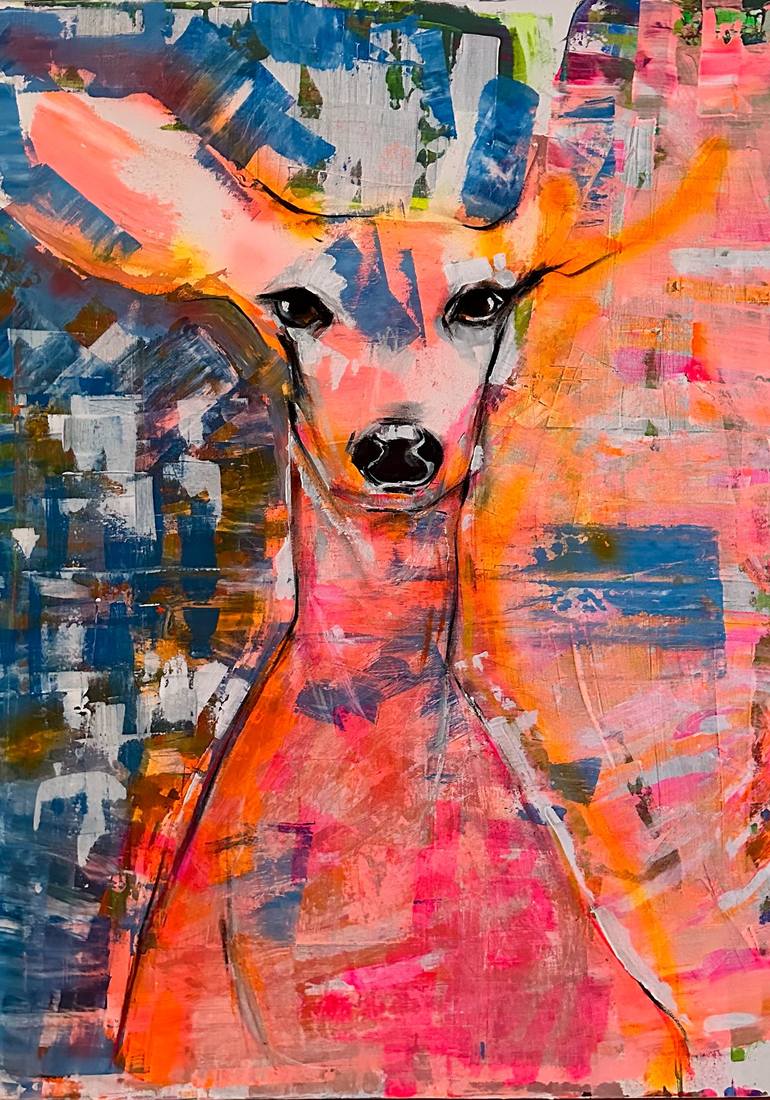 Rather than focusing on the realistic depiction of the deer, I used minimal brush effects and dynamic shapes and lines, and more flowing forms to convey the emotions and ideas that I wanted to express. Color is an essential element in my abstract art, and I use it to express the deer's energy, vital...