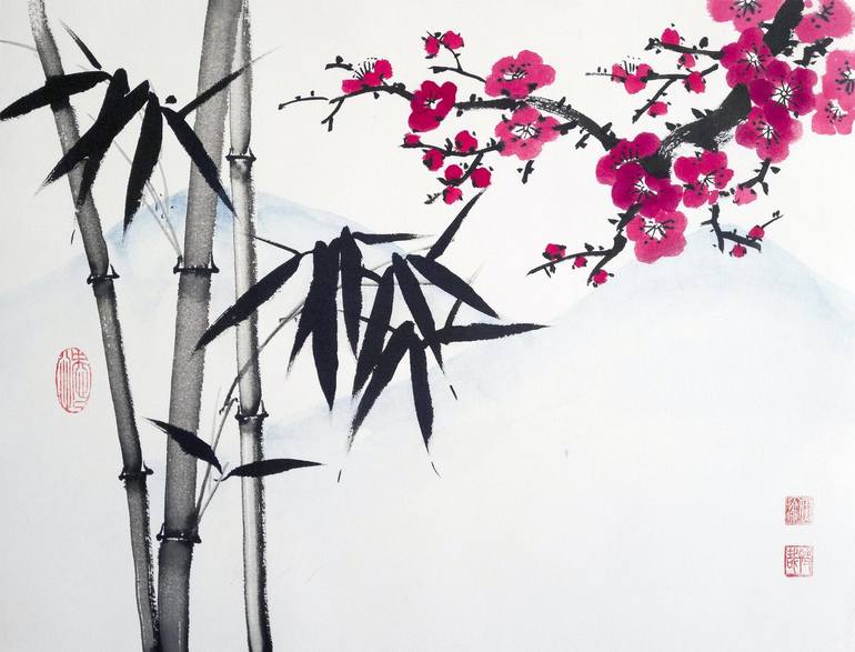 Original Chinese Brush Painting by Ilana Shechter. This artwork is a spontaneous style of Chinese Ink Painting. I painted a series of pictures of bamboo inspired by the magic of the bamboo forest. The painting has three red Traditional Chinese seals, one of them means "Happy" the other is a seal w...