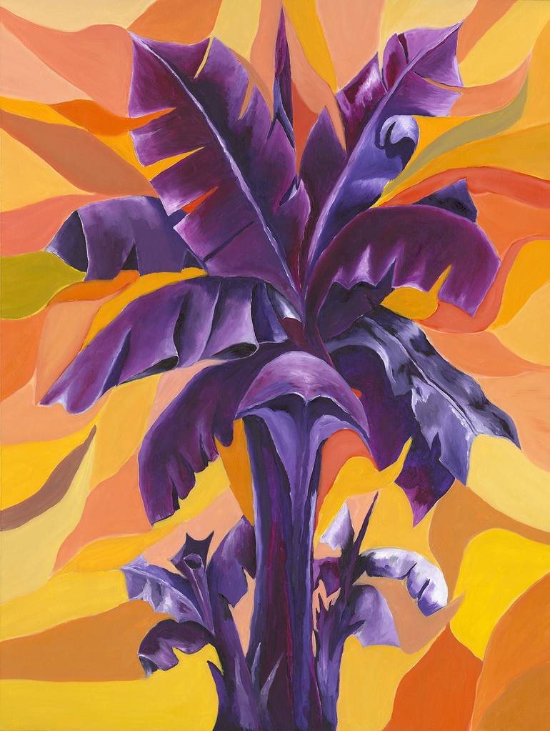 Banana tree with accent on the leaves expressed with various hues of purple dance across the paper with a sunset like background of yellows and oranges