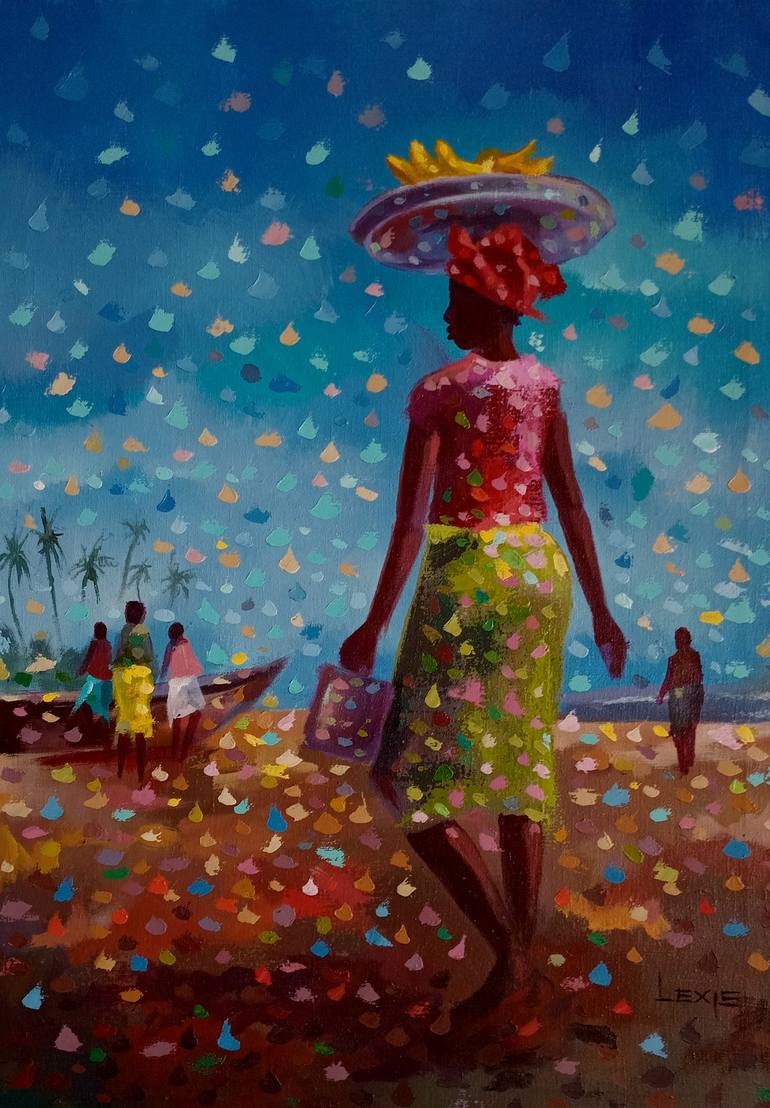 This original, hand-painted artwork depicts a vibrant scene from an African beach, showcasing an industrious banana seller ready to serve beachgoers on a beautiful holiday. The artist captures the entrepreneurial spirit of this smart woman, dressed in a simple green skirt, red top, and matching red ...